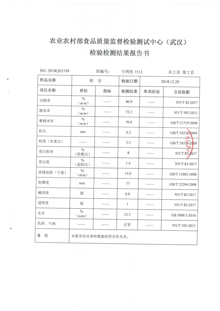 5、高出米率、米質優:2018年武漢米質鑒定主要指標:出糙率80.9%,精米率72.2%,整精米率70.0%,粒長6.2mm,長寬比3.3,堊白粒率8%,堊白度1.4%,膠稠度77毫米,直鏈淀粉含量15.0%。堿消值級6.0,透明度1級。米質優標2級米。